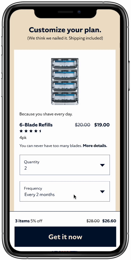 Task 1: You only need 1 pack of blades every 2 months and you want to get 1 shaving butter once a month. You also want to ensure you receive a text message each month to approve shipments before you are billed. Show how you would sign up for a subscription based on these requirements.