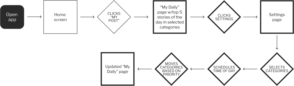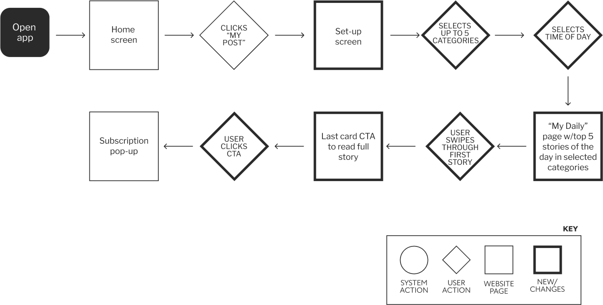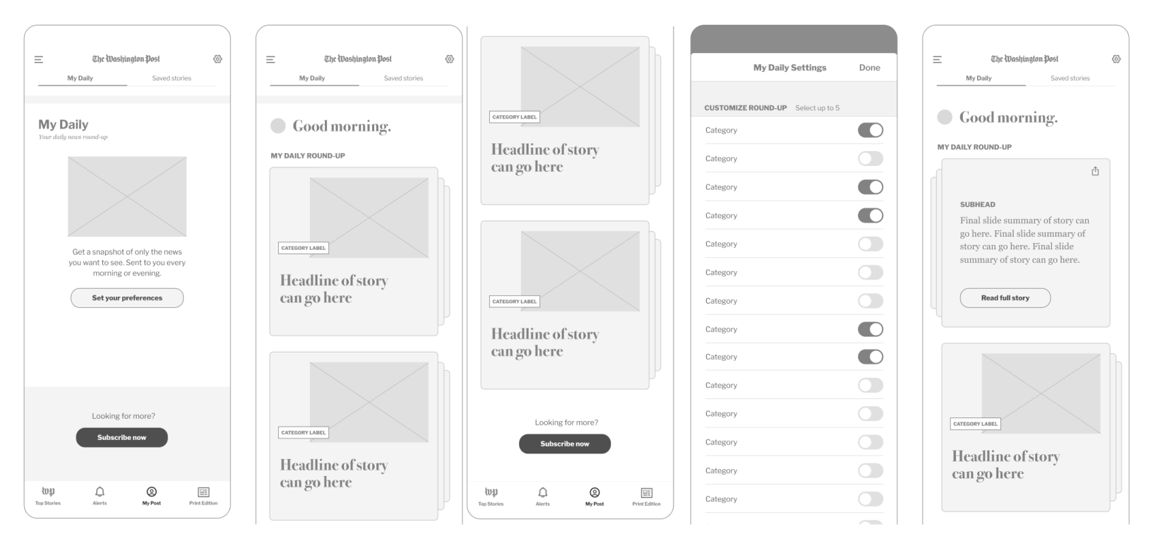 The first task is for the user to set up their own personal, free "My Daily" round-up. They can do this by selecting the categories they are most interested in and choosing the time of day they want to receive the notifications. In this flow, I also included some call-to-actions (CTAs) to encourage the user to subscribe.