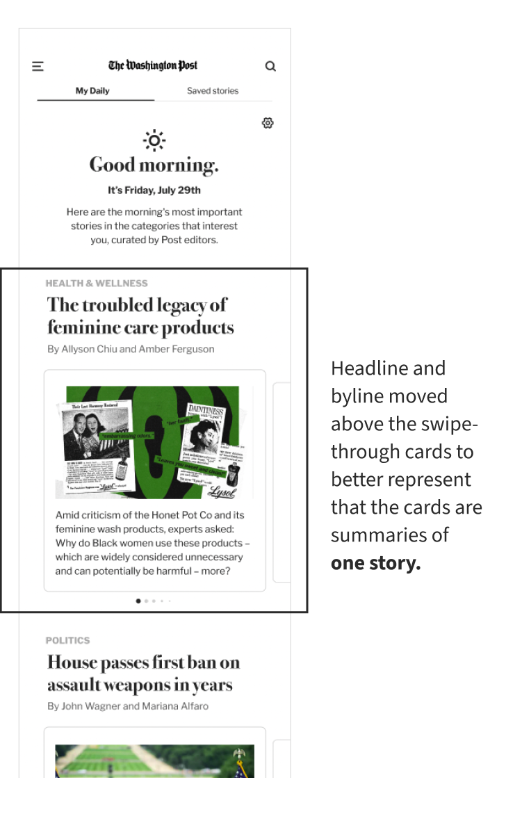 Lastly, I changed the layout of the story cards so the headline and byline are above the cards in order to better represent that the summary is of one story.